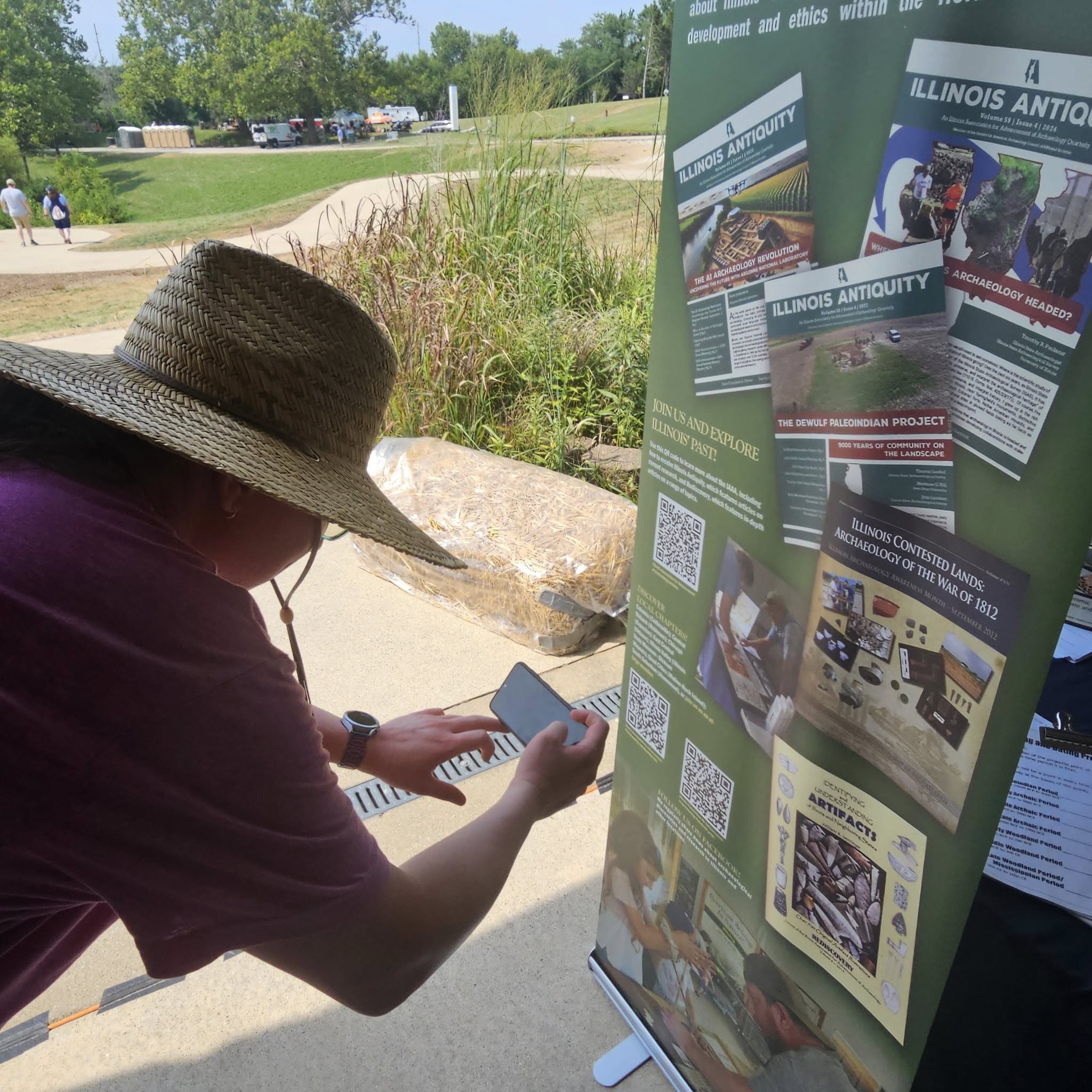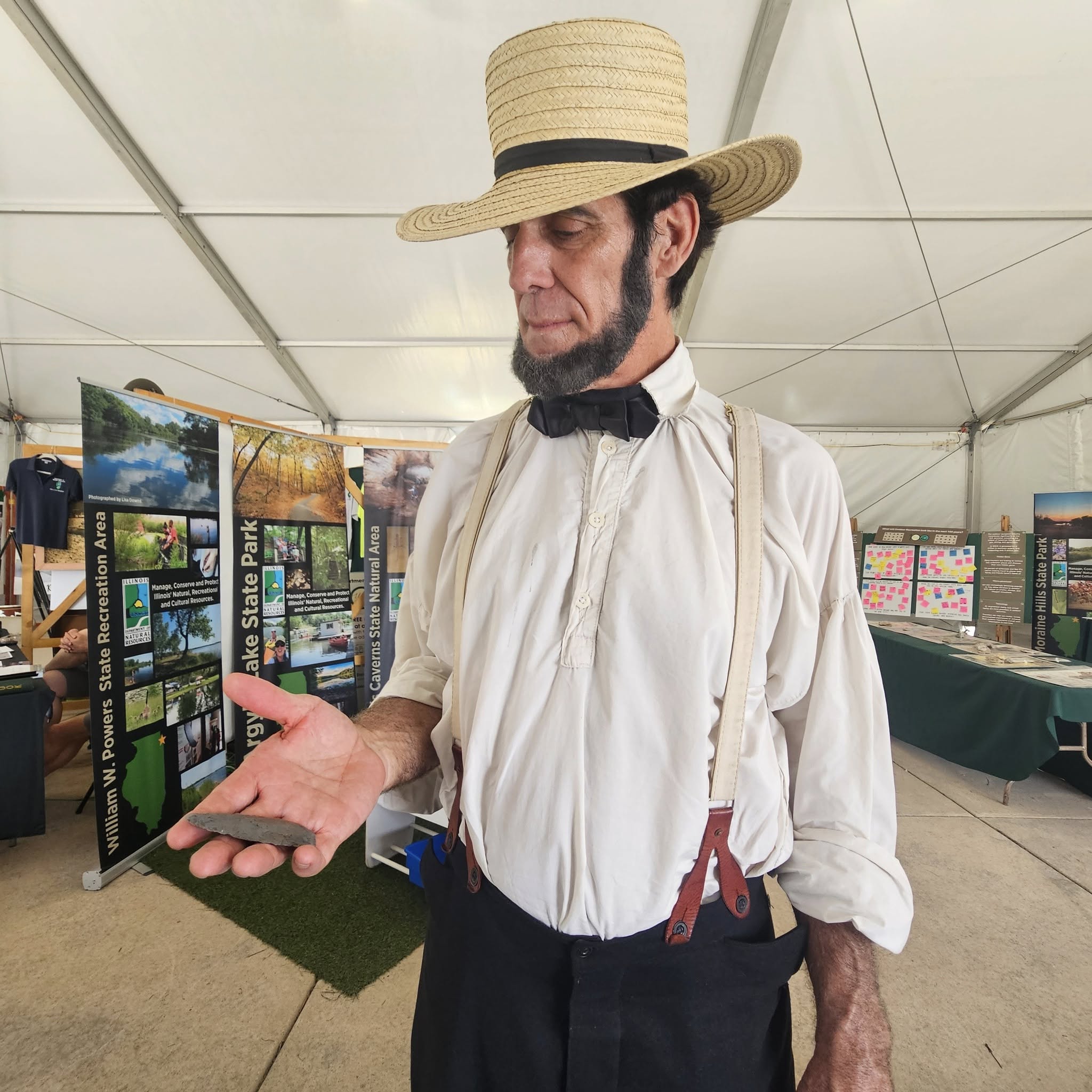 IAAA’s 2025 Illinois State Fair booth experienced unprecedented success, engaging thousands of substantive interactions with fairgoers. Moreover, several attendees utilized IAAA’s new banners’ QR codes to access supplementary links. The day’s events were further enriched by the presence of two distinguished visitors: Dr. Alleen Betzenhauser, the recently appointed Illinois State Archaeologist from the Illinois State Archaeological Survey, and the illustrious President Abraham Lincoln. Dr. Betzenhauser kindly fielded a diversity of questions, with particular emphasis on her areas of expertise on Mississippians and ceramics. President Lincoln, in turn, was deeply touched by the artifacts we presented, and he issued a cautionary note against ‘chronological snobbery,’ which involves regarding past artifacts as inherently inferior or primitive. He instead advocated for a more inclusive understanding, encouraging us to view past artifacts within a broader technological continuum that has enabled human progress. Your insights are truly appreciated, Mr. President!